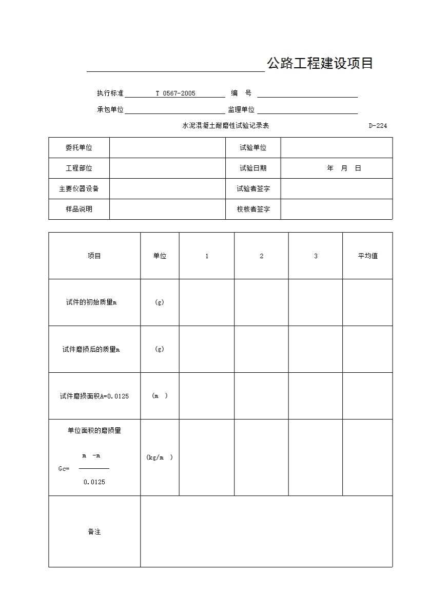 表格名称:D-224 水泥混凝土耐磨性试验记录表