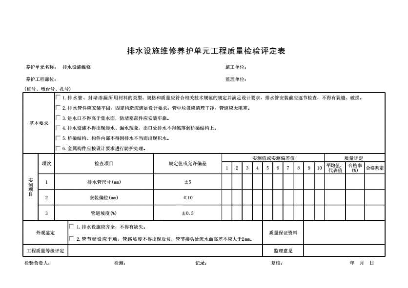 表格名称:排水设施维修养护单元工程质量检验评定表