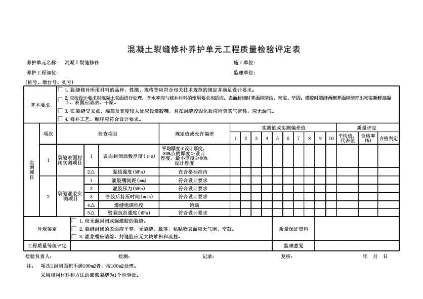 表格名称:混凝土裂缝修补养护单元工程质量检验评定表