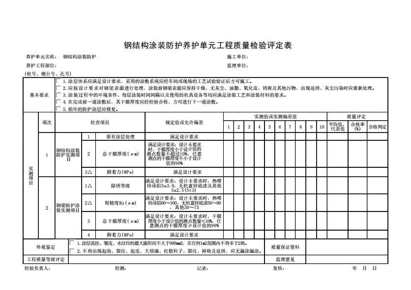 表格名称:钢结构涂装防护养护单元工程质量检验评定表