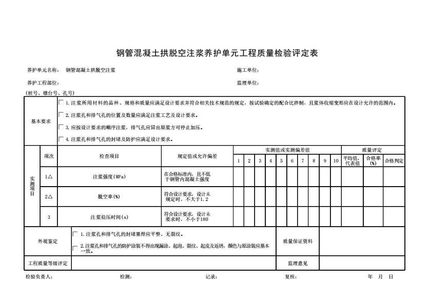 表格名称:钢管混凝土拱脱空注浆养护单元工程质量检验评定表