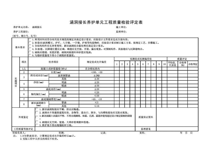 表格名称:涵洞接长养护单元工程质量检验评定表