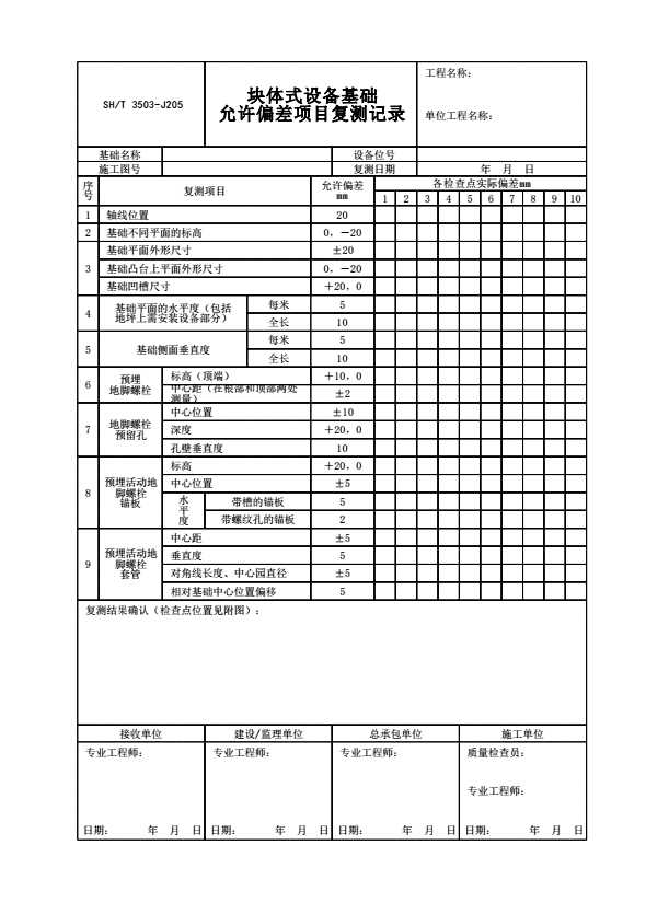 SH/T 3503-J205 块体式设备基础允许偏差项目复测记录