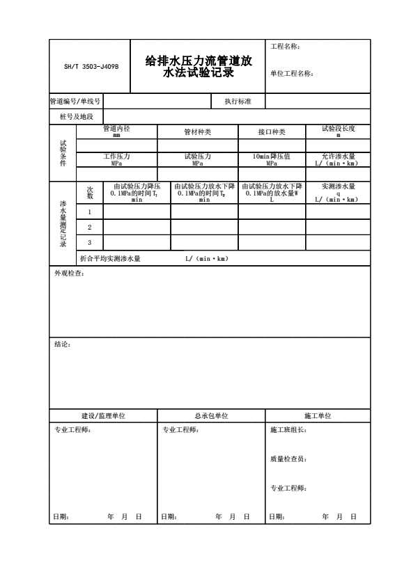 表格名称:SH/T 3503-J409B 给排水压力流管道放水法试验记录