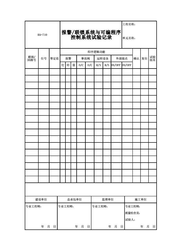 表格名称:HA-710 报警联锁系统与可编程序控制系统试验记录
