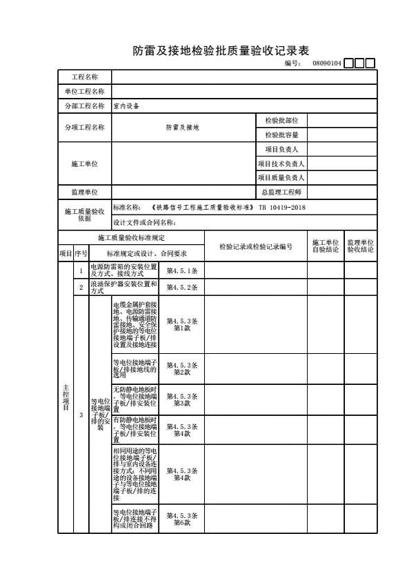 表格名称:08090104 防雷及接地检验批质量验收记录表