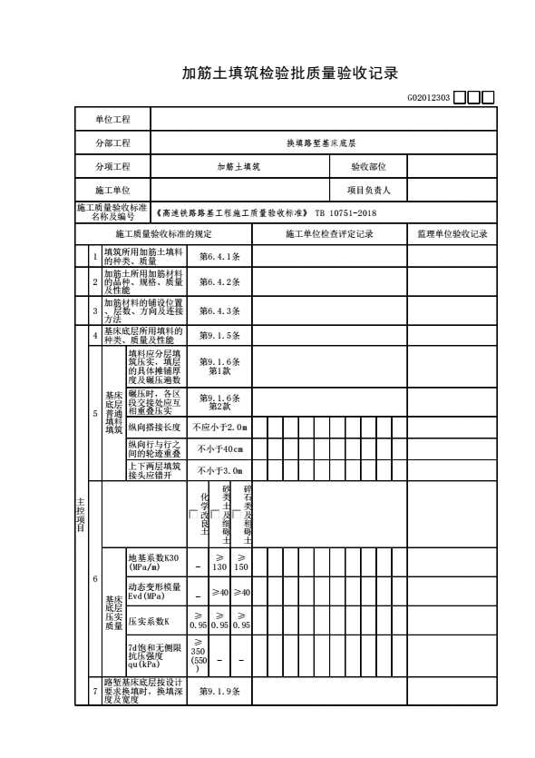 表格名称:G02012303 加筋土填筑检验批质量验收记录