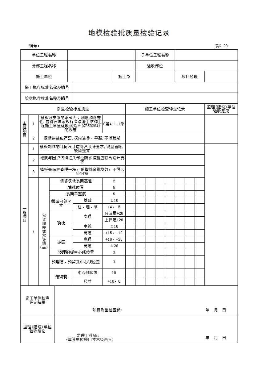 表格名称:表G-38 地模检验批质量检验记录
