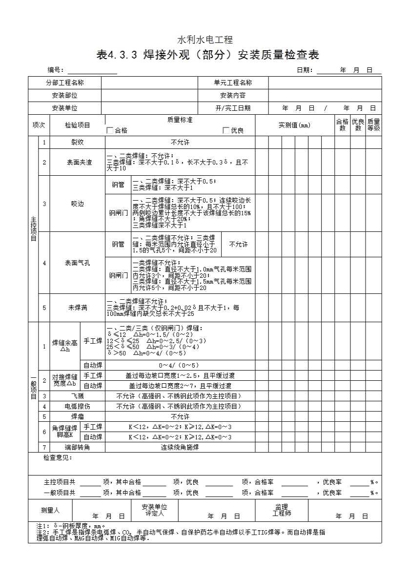 表格名称:表4.3.3 焊接外观(部分)安装质量检查表