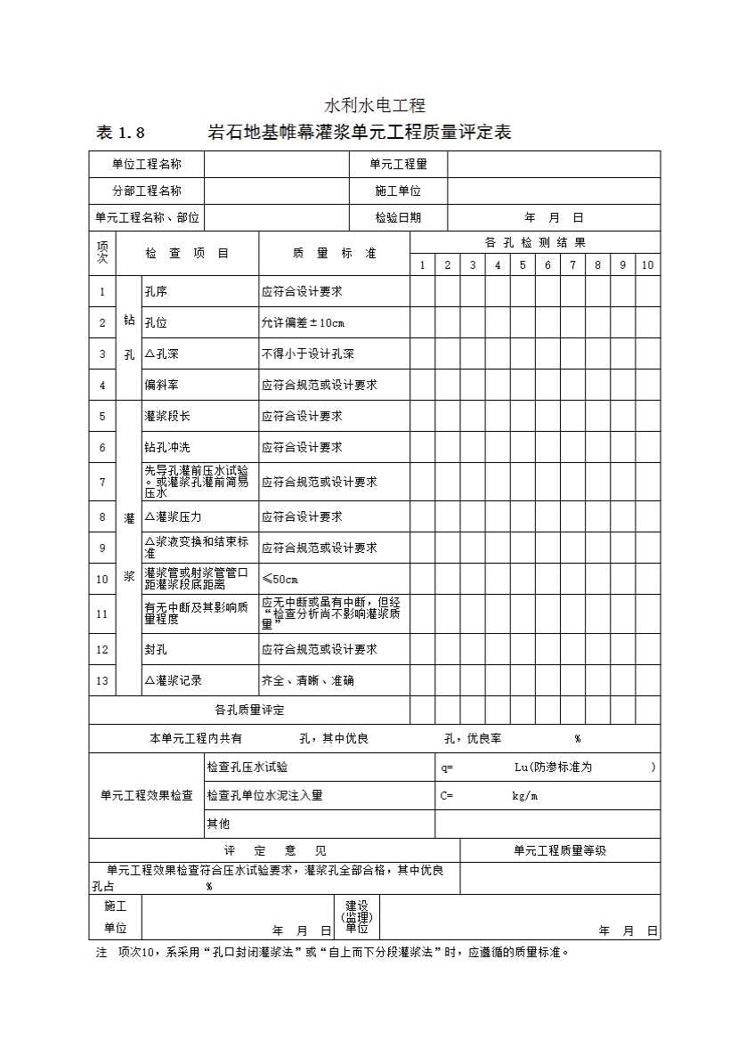 表1.8 岩石地基帷幕灌浆单元工程质量评定表