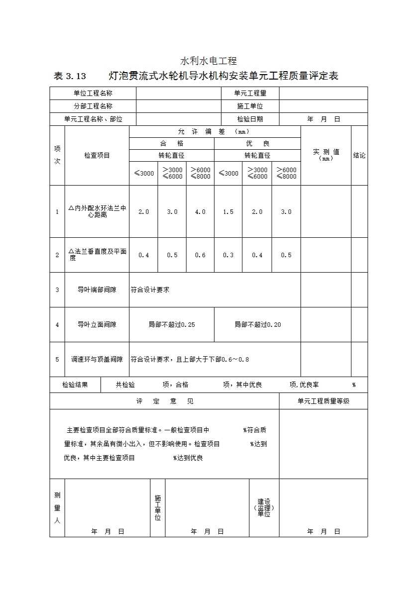 表格名称:表3.13 灯泡贯流式水轮机导水机构安装单元工程质量评定表