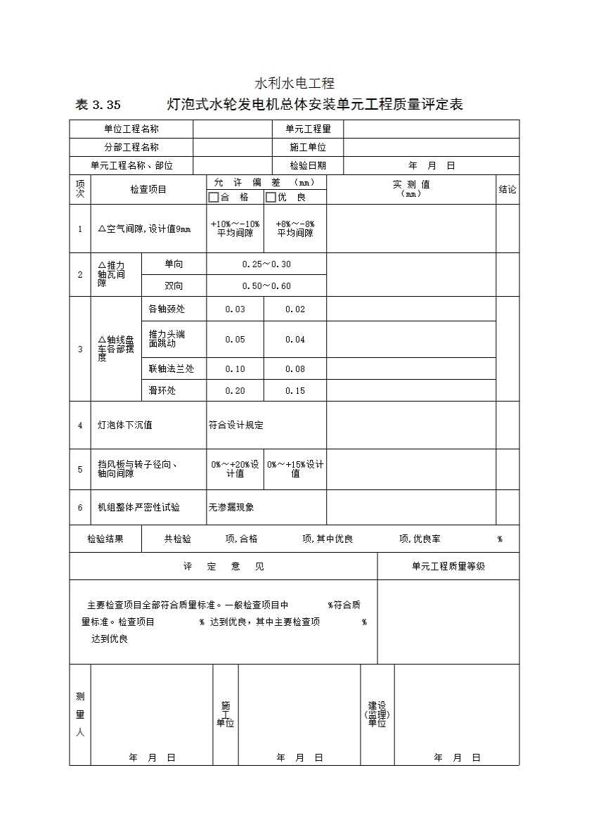 表格名称:表3.35 灯泡式水轮发电机总体安装单元工程质量评定表
