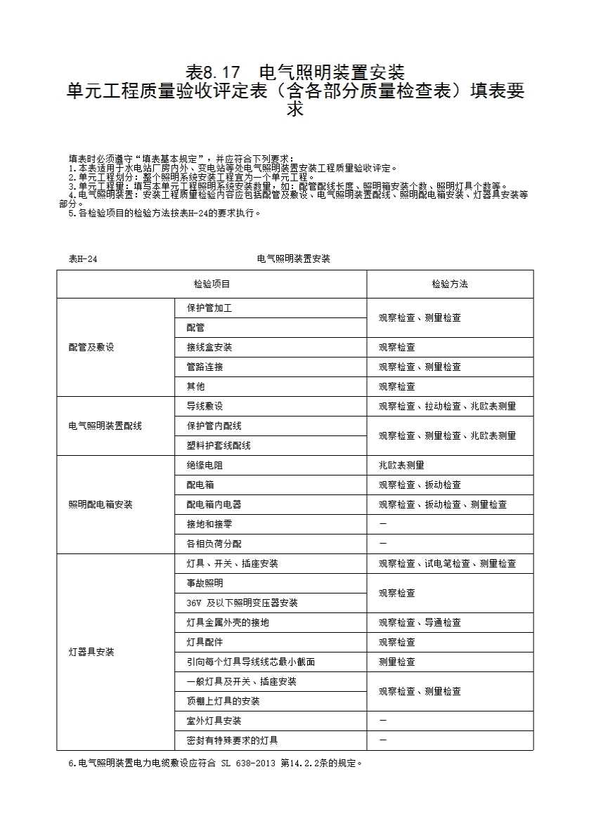 1.本表适用于水电站厂房内外、变电站等处电气照明装置安装工程质量验收评定。