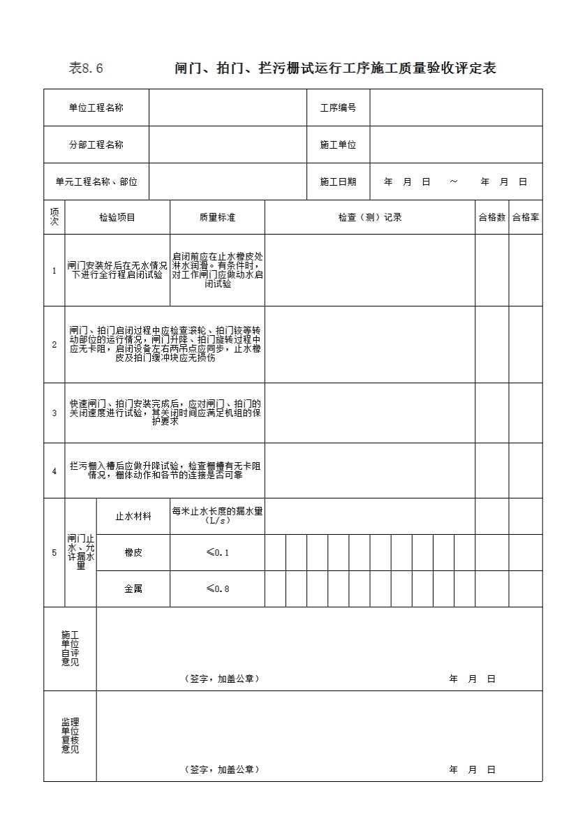 表格名称:8.6 闸门、拍门、拦污栅试运行工序施工质量验收评定表
