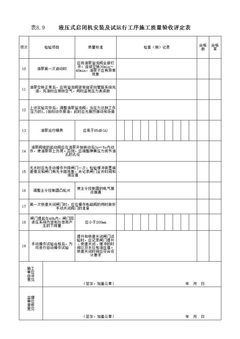 8.9 液压式启闭机安装及试运行工序施工质量验收评定表