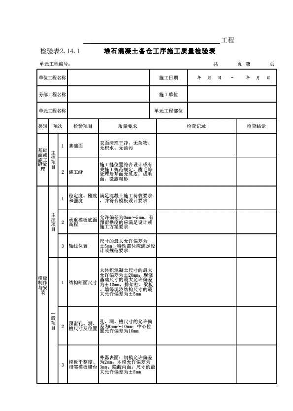 表格名称:表2.14.1 堆石混凝土备仓工序施工质量检验表
