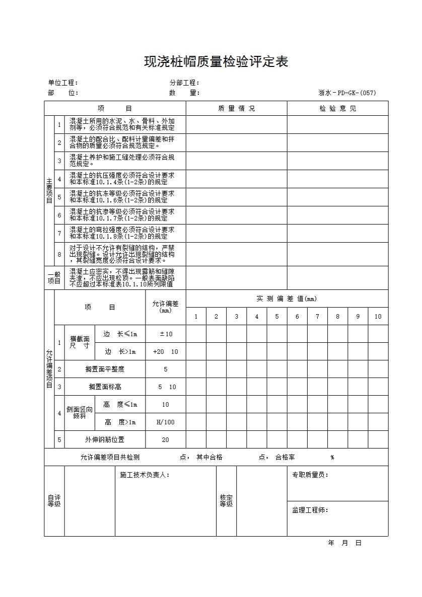 表格名称:057 现浇桩帽质量检验评定表