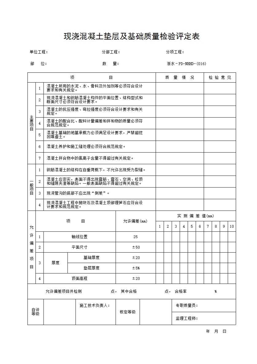 表格名称:016 现浇混凝土垫层及基础质量检验评定表