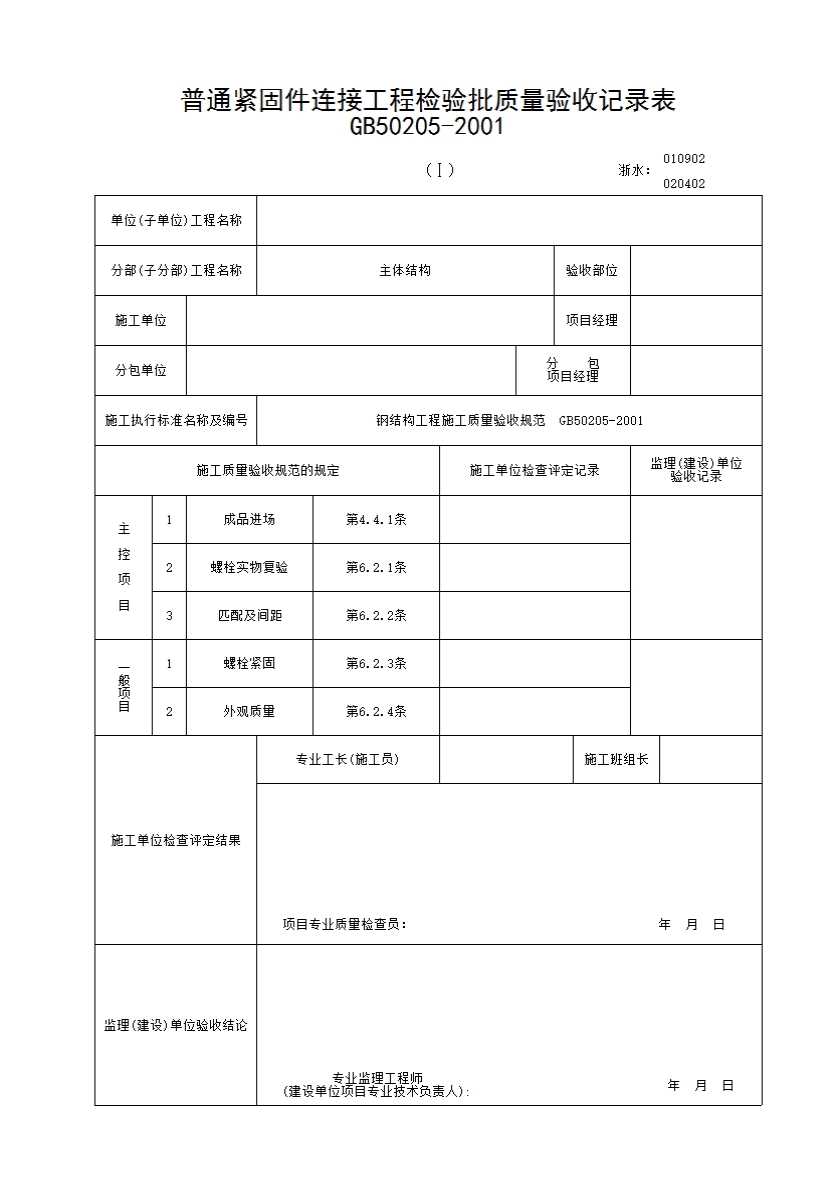 表格名称:071 普通紧固件连接工程检验批质量验收记录表(I)
