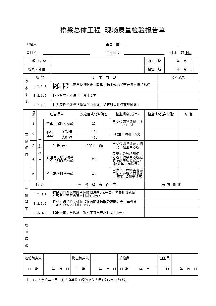 表格名称:浙水:ZJ801 桥梁总体工程现场质量检验报告单