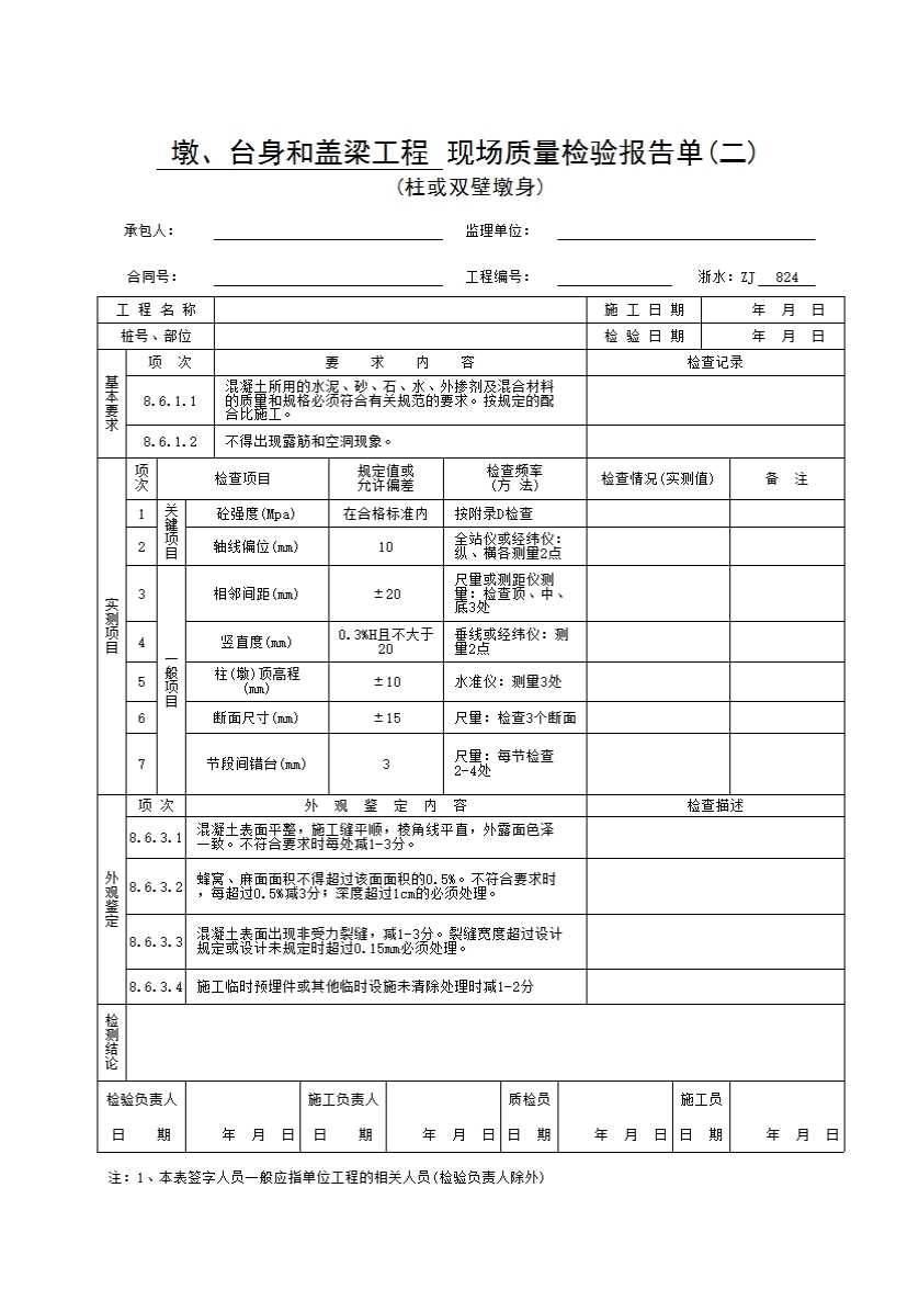 浙水:ZJ824 墩、台身和盖梁工程现场质量检验报告单(二)