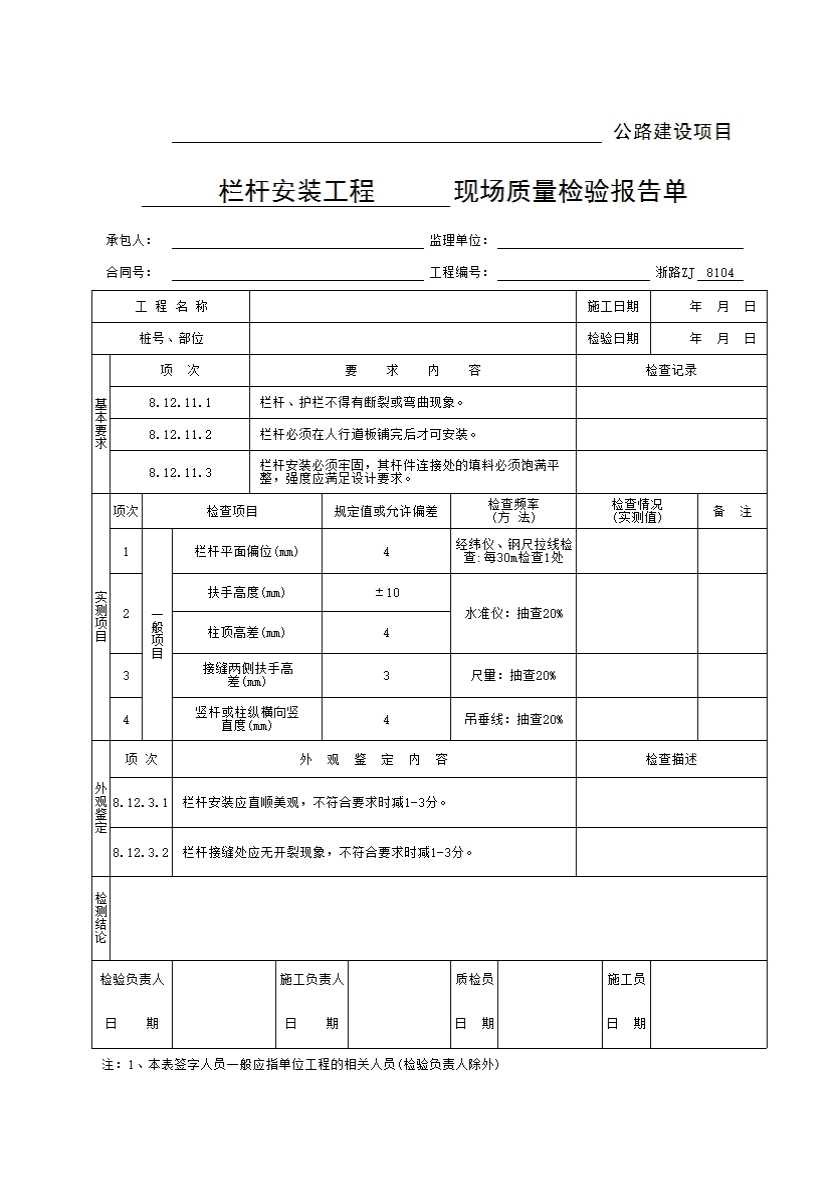 表格名称:浙路ZJ8104 栏杆安装工程现场质量检验报告单