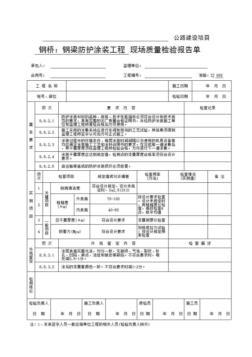 浙路ZJ855 钢桥:钢梁防护涂装工程现场质量检验报告单