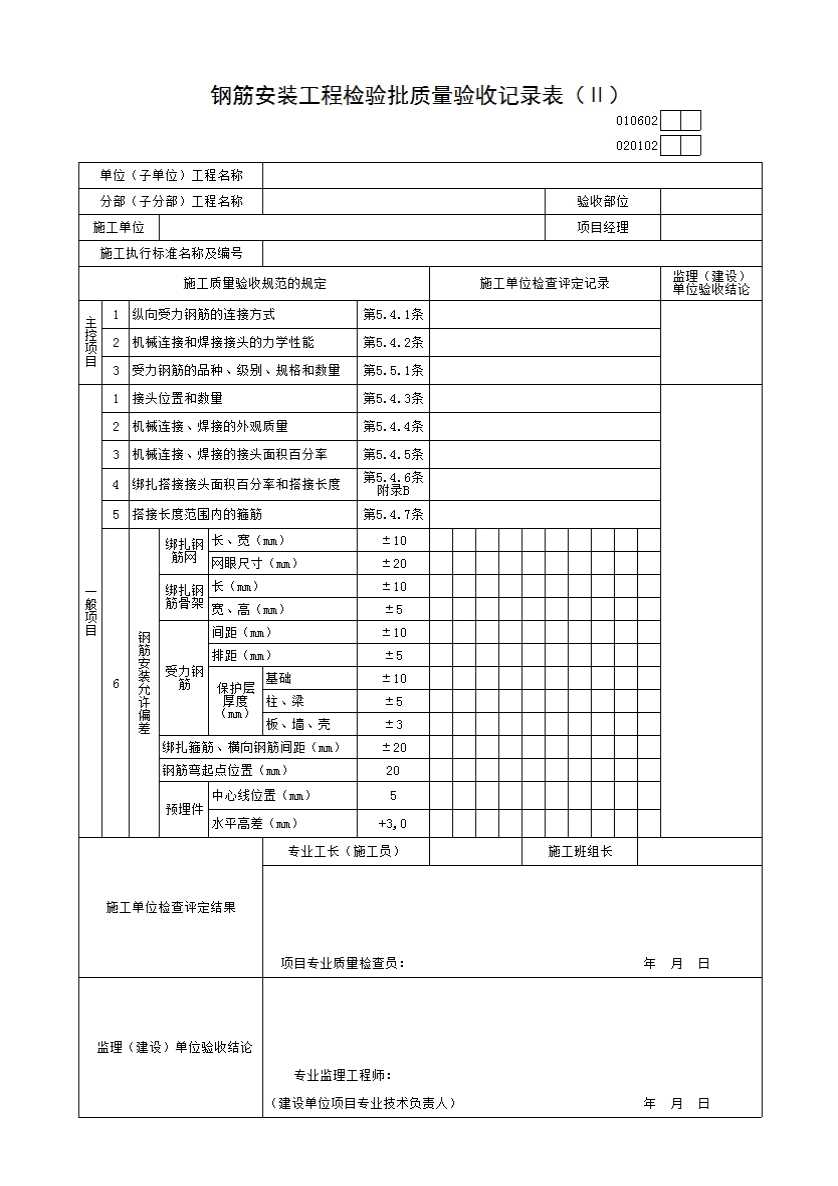 表格名称:010602 钢筋安装工程检验批质量验收记录表(Ⅱ)