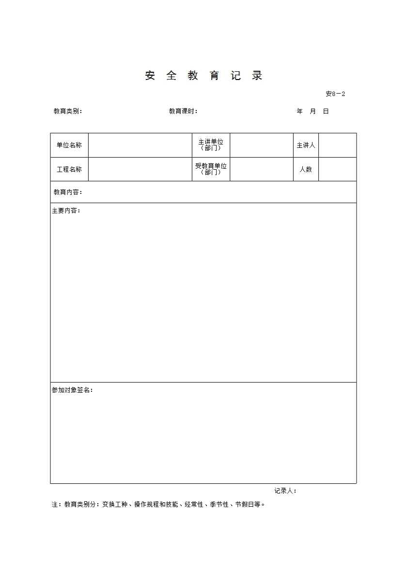 表格名称:安全教育记录 安8—2