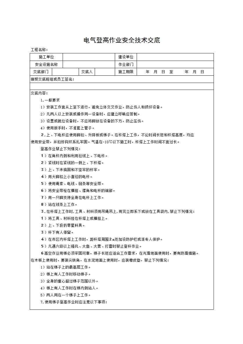 表格名称:电气登高作业安全技术交底