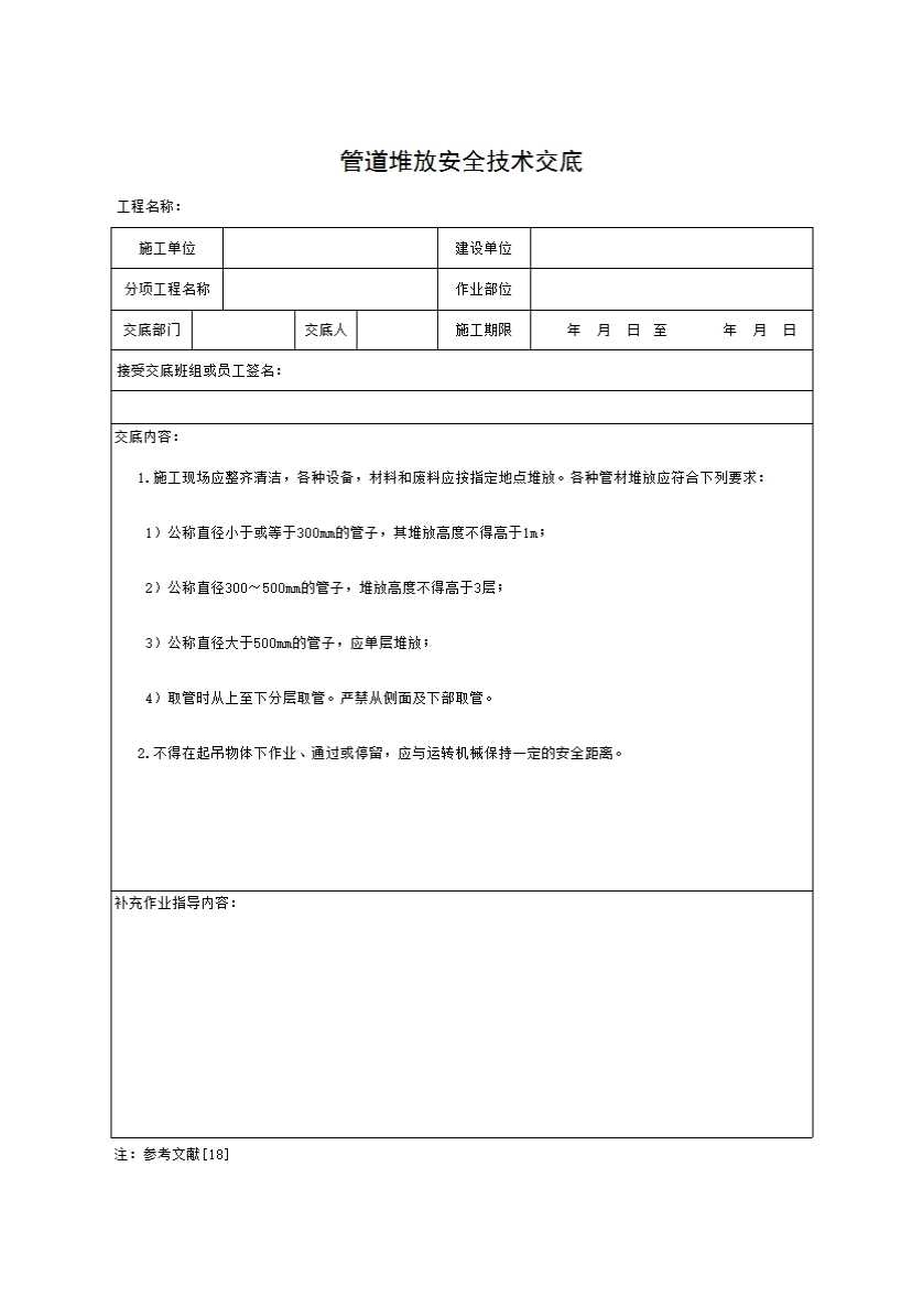 表格名称:管道堆放安全技术交底