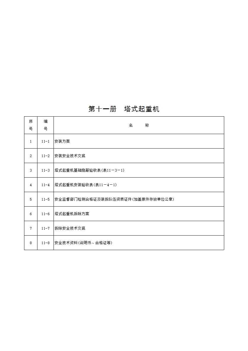表格名称:第十一册 塔式起重机