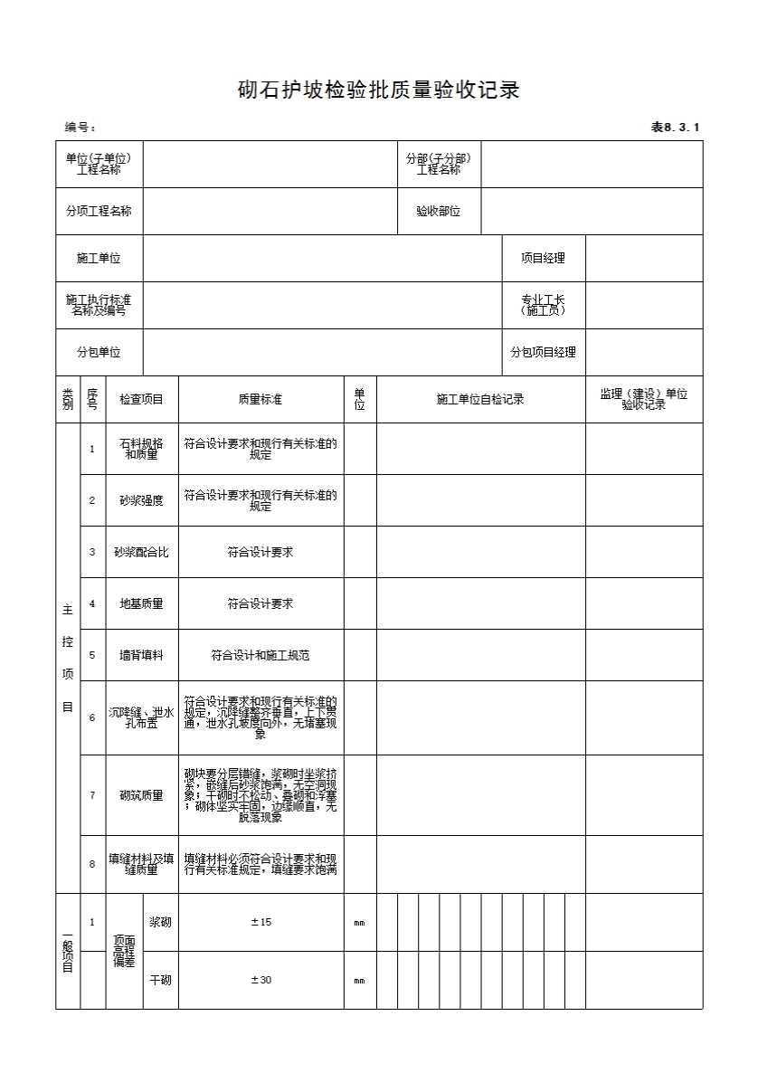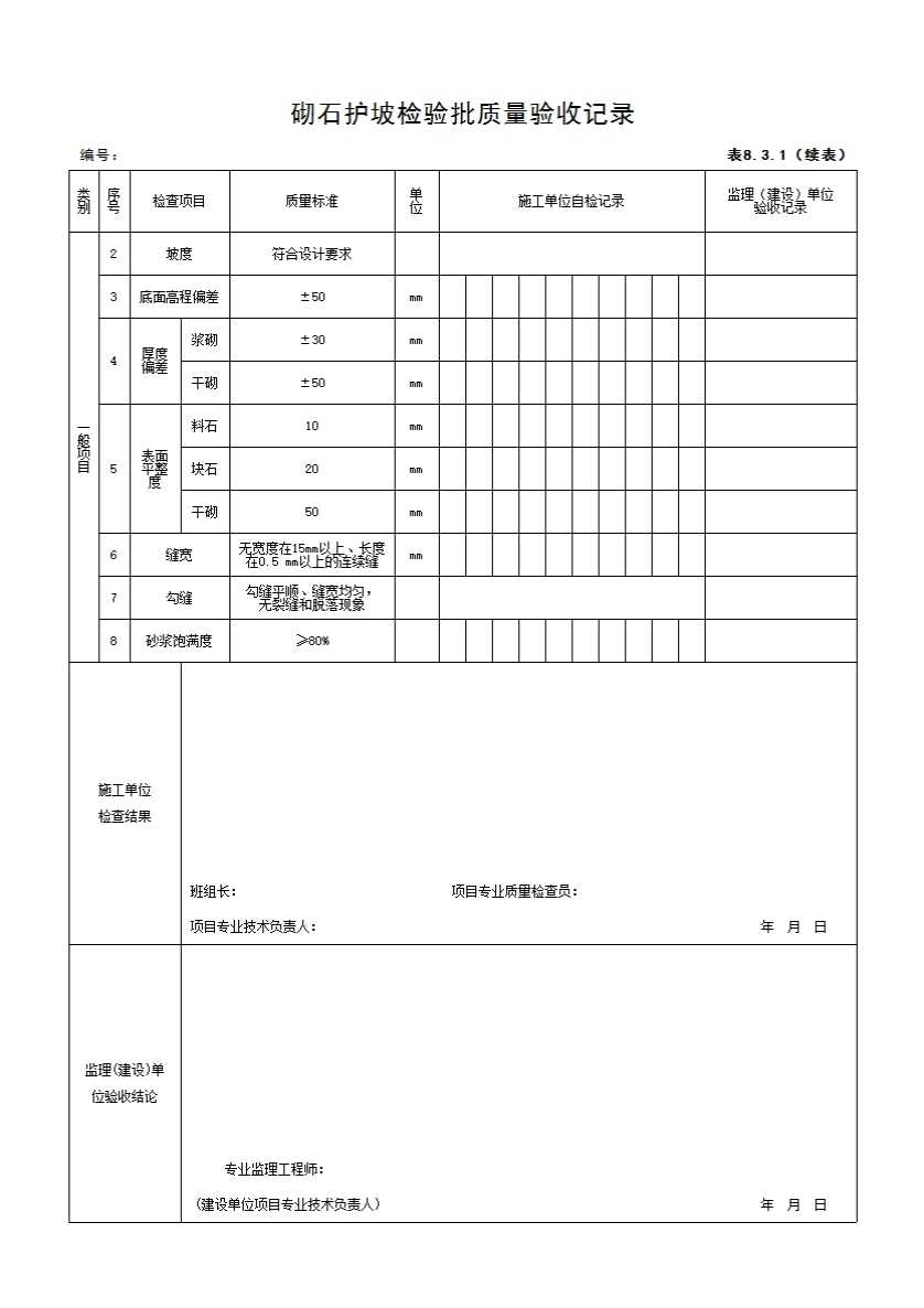 表格名称:8.3.1 砌石护坡检验批质量验收记录