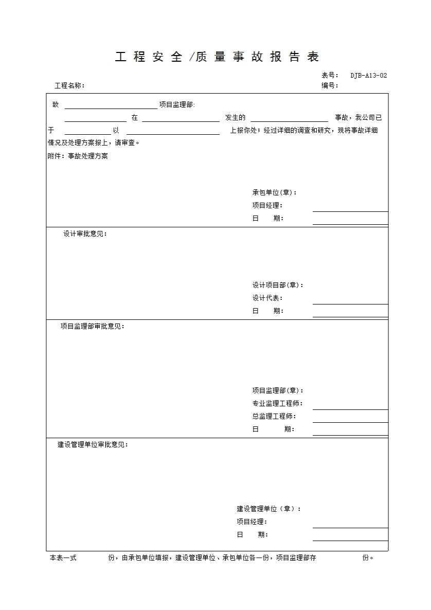 表格名称:DJB-A13-02 工程安全质量事故处理方案报审表