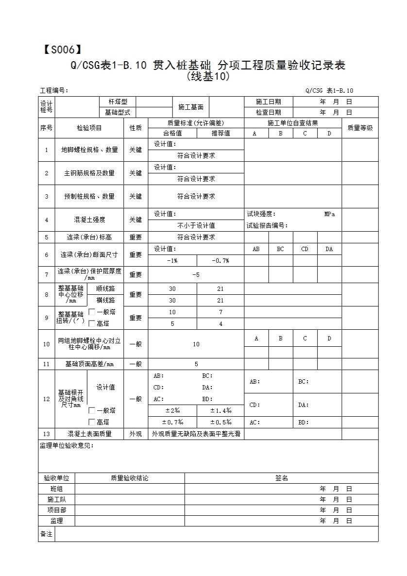 表格名称:QCSG 表 1-B.10 灌入桩基础 分项工程质量验收记录表(线基10)