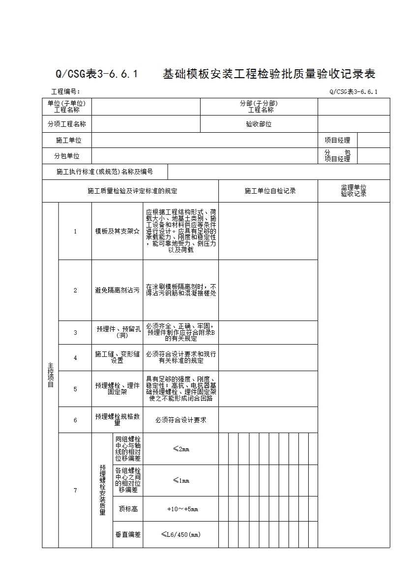 QCSG 表 3-6.7.1 模板安装工程检验批质量验收记录表