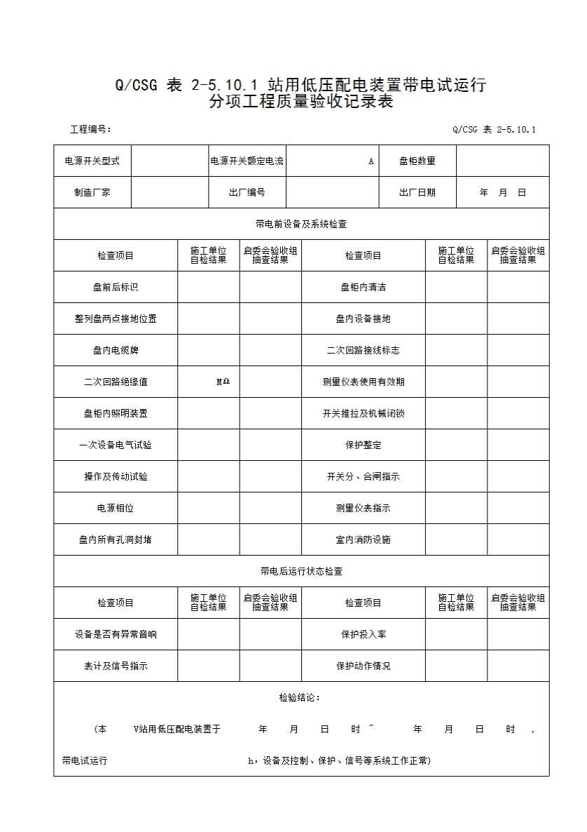 QCSG 表 3-11.3.4 站用低压配电装置带电试运行 分项工程质量验收记录表