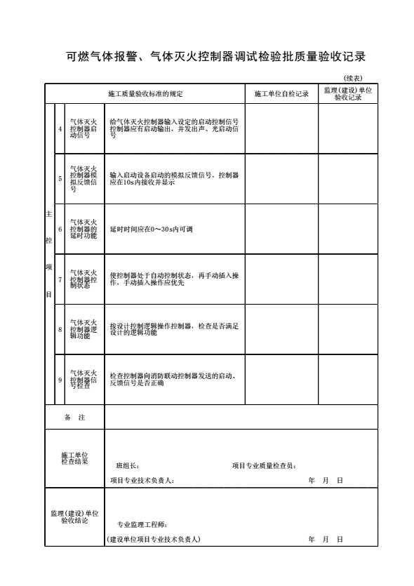 表格名称:可燃气体报警、气体灭火控制器调试检验批质量验收记录