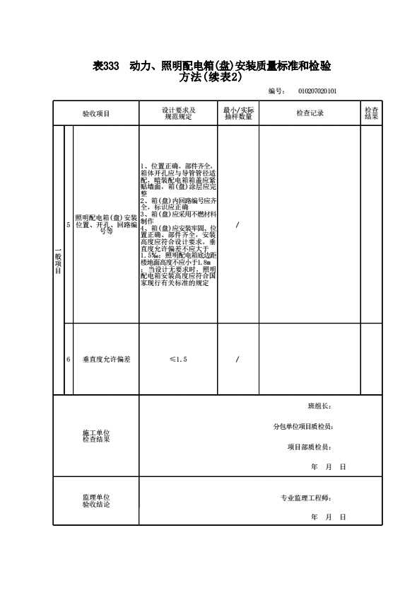 表格名称:010207020101 动力、照明配电箱(盘)安装质量标准和检验方法