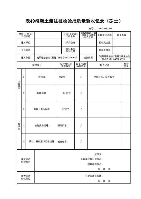 表格名称:020101040206 混凝土灌注桩检验批质量验收记录(冻土)
