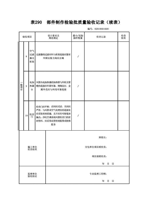 表格名称:020106010201 部件制作检验批质量验收记录