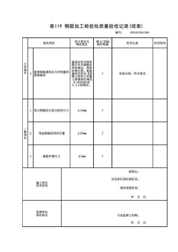 表格名称:050101061206 钢筋加工检验批质量验收记录