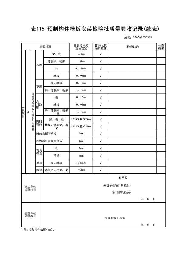 表格名称:050501050303 预制构件模板安装检验批质量验收记录