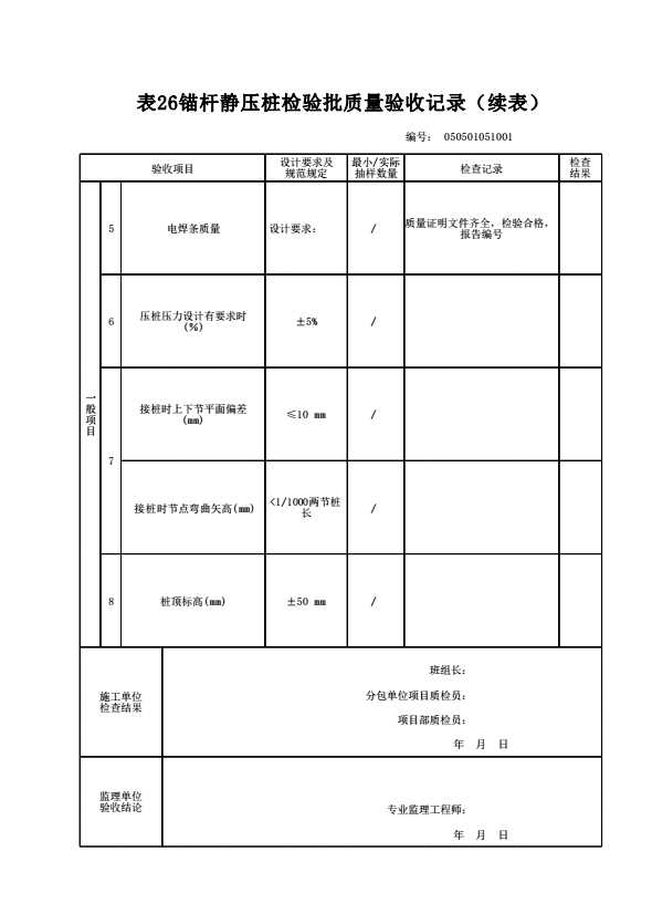 表格名称:050501051001 锚杆静压桩检验批质量验收记录