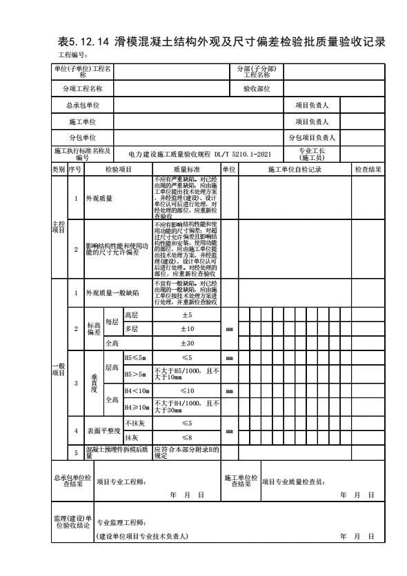 表格名称:表5.12.14 滑模混凝土结构外观及尺寸偏差检验批质量验收记录