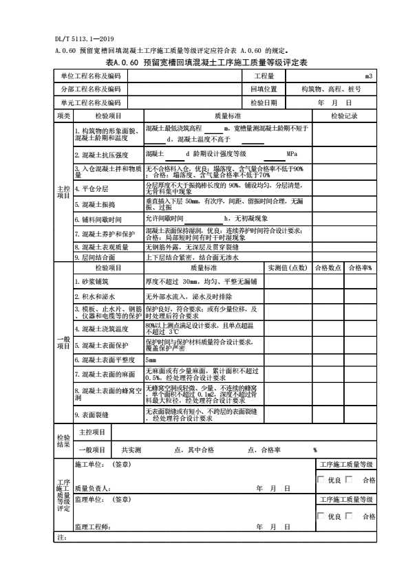 表格名称:表A.O.60 预留宽槽回填混凝土工序施工质量等级评定表
