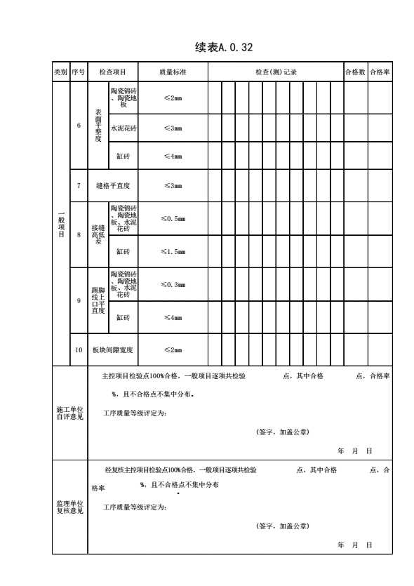 表格名称:表A.0.32 砖面层工程质量评定表