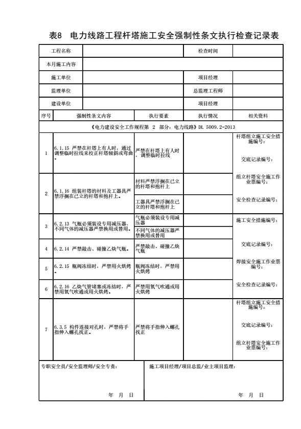 表格名称:表8 电力线路工程杆塔施工安全强制性条文执行检查记录表