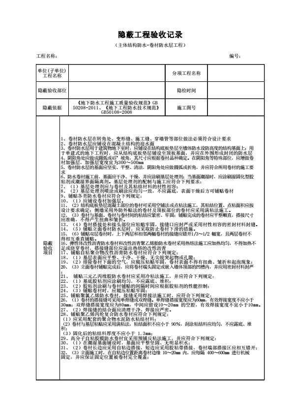 表格名称:隐蔽工程验收记录(主体结构防水-卷材防水层工程)