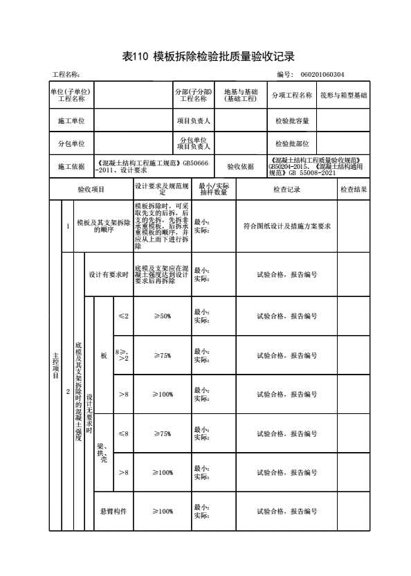 表格名称:060201060304 模板拆除检验批质量验收记录